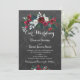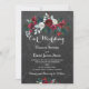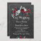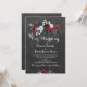 Floral bouquet of red burgundy and white peony roses with pine green fir branches and foliage wedding invitation template on a dark grey charcoal chalkboard background with a fancy modern contemporary changeable script text. -------- The invitation is ideal for winter floral / Christmas weddings.