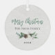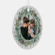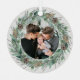 Elegant "Merry Christmas" round metal holiday photo ornament design features a rustic chic white wood grain background with a wreath of winter watercolor greenery framing the family picture. Personalize the modern and stylish green and charcoal grey wording with your choice of greeting, last name, and the year.