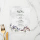 A rustic winter wedding menu with a beautiful snow covered mountain evergreen forest scene.