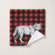 Rustic black and white wolf illustration towel set with a black and red buffalo plaid background.