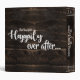 a RUSTIC wood background and the quote " the ADVENTURE BEGINS " written in brush font alongwith the names of the bride and groom and a quote " And they lived Happily ever after " on the