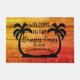 Tropical beach house welcome doormat with a rustic wood background and black palm trees silhouette.