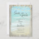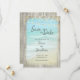 Rustic wood frames a beach photo with the waves crashing onto the shore. String lights accent the top. Elegant brush script announces Save the Date, with easily personalized text giving the details of your future wedding date.