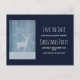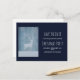 Christmas party save the date postcard with a blue-toned faux-wood background. Layered over top is a silhouette of a reindeer with big antlers and some pretty snowflakes and stars falling down around him.