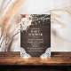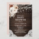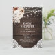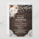 Boho rustic baby shower invitation features beige and white flowers and pampa grass on a wood background.
