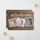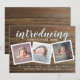 Announce the birth of your little one with this rustic birth announcement featuring 3 of your photos in a snapshot / scrapbook style with a faux wooden background and modern calligraphy script in a pale blue.