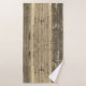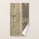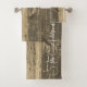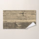 Sur cet ensemble élégant de serviettes est un design rustique de planches de bois patiné brun créant un charme champêtre où vous pouvez personnaliser sur la grande serviette avec un nom de famille ou logo. Décor de cottage moderne