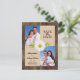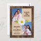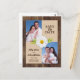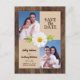 Rustic wood and white daisy flower photo wedding save the date postcard. There are two photo frame templates that you can change out to your own engagement photos. This rustic daisy photo wedding save the date postcard has a simulated wood or woodgrain background in a medium to dark brown. There is a pretty white daisy flower in the middle centre overlaying the two photos (one in the top left corner and one in the bottom right corner). All the wording is completely customizable as well. This is a nice photo wedding save the date postcard for a rustic sunflower themed wedding in the spring, summer or fall / autumn.