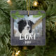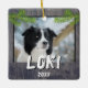 Rustic Wood Dog Pet Photo Christmas Keepsake Ceramic Ornament. Dark wood background with green pine branches. Add your pet`s name, year and photo. Sweet Christmas holiday keepsake for a dog owner.