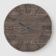 A rustic wood effect (not real wood) design round wallclock with Roman numerals in black.