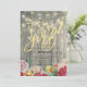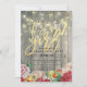 Baby Shower Invitation Cards Templates - Faux Gold Foil Script with Floral and String Lights on Rustic Wood Background.