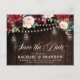 Rustic country wood floral boho wedding save the date card features hand-painted watercolor floral graphics / roses in rich tones of Burgundy , Marsala Red navy blue and blush pink / peach and charming hand lettering style font with String lights mason jar and lace wooden background. Please contact me for any help in customization or if you need any other product with this design.