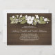 Vintage rustic rehearsal dinner invitation with peonies, dogwood flowers accompany anemones in a garden style bouquet. Nice old wood background texture. Perfect invite for rustic country barn rehearsal dinner. Full of white flowers invitation backside.