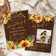 Rustic country yellow golden sunflowers botanical greenery budget affordable all in one brown wood wedding invitation with custom photo, QR code to website, and online rsvp featuring a chic handwriting faux gold calligraphy script. +++++ Suitable for rustic modern summer or autumn fall garden or outdoor backyard farmhouse barn weddings.