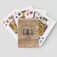 Rustic themed playing cards personalized with your cabin, lake house, lodge or rental property name and established date. The design features a wilderness forest pine trees scenic image against a brown country wood plank background. ASSISTANCE: For help with design modification or personalization, transferring the design to another product or if you would like coordinating items, contact the designer BEFORE ORDERING via the Zazzle Chat MESSAGE tab below or email makeitaboutyoustore@gmail.com.
