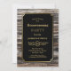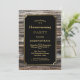 A rustic gold bordered wood housewarming party invitation with gold text on a black background.