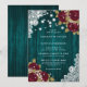 Elegant personalized rustic teal and burgundy wedding invitations featuring burgundy roses and breath baby's on a barn wood background adorned with floral lace and string lights. Perfect card design for inviting your guests to your burgundy and teal rustic wedding party. Matching items available to complement these rustic teal and burgundy floral wedding invitations.