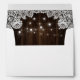 Rustic wedding envelopes featuring white floral lace and string lights on a barn wood background. Easily personalize with a return address.