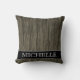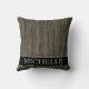 This pillow design features a rustic pattern with a brown wood like appearance. It also features a customized name.