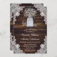 Rustic country baby's breath wedding invitation featuring baby's breath inside a mason jar on a rustic wood and lace background adorned with string lights. Easily personalize our rustic country floral wedding invitation for your rustic country, or barn wedding party inspired by baby's breath flowers.