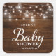 Rustic Baby Shower square sticker featuring lights in mason jars and strings of lights with the word "Baby Shower" against a brown wood pattern background. It's the perfect sticker for a rustic or country baby shower. Check out matching invitation and items like stickers and stamps here https://www.zazzle.com/collections/rustic_wood_mason_jars_and_lights-119202204970019494?rf=238364477188679314
