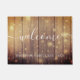 Elegant personalized family name doormat featuring your established date set in classic white typography on a rustic wood panels background with the message "welcome" set in an elegant script white text. Designed by Thisisnotme©