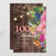 Beautiful pink, blue, orange, and yellow watercolor floral and greenery botanical 100 and Fabulous 100th birthday party invitation for women on a rustic dark brown wood background with string lights and a cute cursive script font. The back of this card is a matching wood background. Contact us for help with customization or to request matching products.