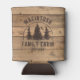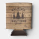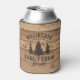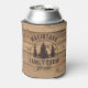 Personalized can cooler or coozie featuring a rustic, country wood plank design with forest pine trees and your custom text in your choice of font style and colours (shown with NAME FAMILY CABIN and year established date in brown). ASSISTANCE: For help with design modification or personalization, transferring the design to another product or if you would like coordinating items, contact the designer BEFORE ORDERING via the Zazzle Chat MESSAGE tab below or email makeitaboutyoustore@gmail.com.