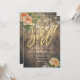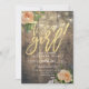 Baby Shower Invitation Cards Templates - Faux Gold Foil Script with Peach White Roses Floral and String Lights on Rustic Wood Background.