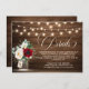 Rustic country string lights and mason jar with burgundy, red, Marsala, maroon , ivory, blush colour floral bouquet and eucalyptus leaves on wood background wedding details card. Please contact me for any help in customization or if you need any other product with this design.