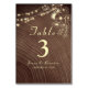 Elegant, modern, rustic wood wedding table number, with gold floral lace and string lights.