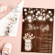 A cool, rustic fall autumn It's a girl baby shower. With string light fairy lights, and stars, a glowing mason jar with wild flowers on rustic brown wood , with a hand lettered glowing boho calligraphy.