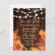 Rustic brown wood with string lights wedding save the date with hand painted orange and red leaf, flowers, wheat branches bouquet and orange pumpkins on a vintage brown wood and elegant calligraphy typography. Perfect for fall autumn weddings. Perfect for country , barn wedding themes.