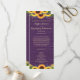 This rustic country design features gold string lights and lace along with sunflowers and lavender sprigs against a purple barn wood background. The text, with customizable bride and groom names and event details, appears in pale gold in popular script and serif typography. You can personalize this program for your own wedding by changing the text in the template.