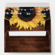Custom rustic sunflower envelopes with a return address featuring sunflower flowers, barn wood and string lights. Matching items available.