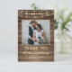 Your wedding photo is accented with a rustic, country, brown weathered wood plank background and soft yellow glow string lights along with the title of THANK YOU and your wedding date in a country western hand-printed font and your name in a rough brush script font. The back of the card features the same wood plank background and offers a place to add a pre-printed thank-you message (or delete the sample text to leave blank for personal handwritten notes of gratitude).