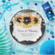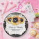 Custom rustic wood and sunflower wedding paper plates featuring sunflower flowers and string lights on a barn wood background. Matching items available to complement these rustic floral wedding paper plates. Easily personalize to any occasion.