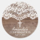 Rustic Wood background with a beautiful white vintage lace Confirmation sticker or envelope seal