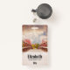 Personalized name badge with a scenic photograph. A wooden bridge leading toward a pathway surrounded by forest trees changing colour.