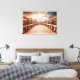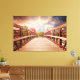 Canvas print with a scenic photograph. A wooden bridge leading toward a pathway surrounded by forest trees changing colour.