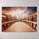 Poster with a scenic photograph. A wooden bridge leading toward a pathway surrounded by forest trees changing colour.