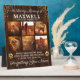 Personalized dog photo plaque featuring a rustic wood background, 6 precious pictures of your beloved pet, gold heart pawprints & glitter, the text "in loving memory of", your dogs name, birth/death dates, and the sympathy quote "your presence we miss, your memory we treasure, loving you always, forgetting you never".