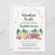 Sweet rustic baby sprinkle invitation featuring cute illustrations of woodland animals with their tent camping in the mountains and forest, an overlay of gold stars and "Adventure Awaits" and the mother-to-be's name in a dark hunter green script. Easily personalize the baby sprinkle shower details.