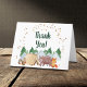Rustic baby shower folded thank you card featuring a cute watercolor illustration of woodland animals with their tent camping in the mountains and forest, an overlay of gold stars and "Thank You" in a dark hunter green script. On the inside, add your personalized thank you message and your names in a signature hunter green script.