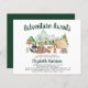 Cute budget-friendly rustic baby shower invitation featuring an illustration of woodland animals with their tent and campfire camping in the mountains and forest , and "Adventure Awaits" and the mother-to-be's name in a dark green script.