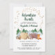 Sweet rustic couple's baby shower invitation featuring a cute illustration of woodland animals with their tent camping in the mountains and forest, an overlay of gold stars and "Adventure Awaits" and the names of the mother and father in a dark hunter green script. Easily personalize the shower details.