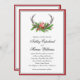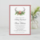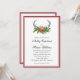 A lovely rustic woodland wedding invitation with deer antlers covered in winter greenery with a red cardinal sitting atop the branches. A coordinating dark red and black border frames the text beautifully.