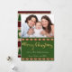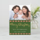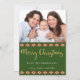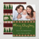 The festive holiday design on the back of this card features a combination of red tartan plaid, southwestern diamonds, pine trees, and woodland animals, including bear, elk, crow, and fox, on a forest green background. On the front is a photo that you can place with your own, and the words "Merry Christmas" in popular gold script typography on a forest green background, followed by two white "from" lines that you can personalize.