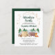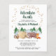 Budget-friendly rustic couples baby shower invitation featuring a cute illustration of woodland animals with their tent camping in the mountains and forest, an overlay of gold stars and "Adventure Awaits" and the names of the mother and father in a dark green script.
