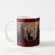 Rustic Woodland Deer Mug With custom rustic wood background and red buffalo plaid pattern on top and bottom of the glass. This is the perfect mug design for a winter scene.